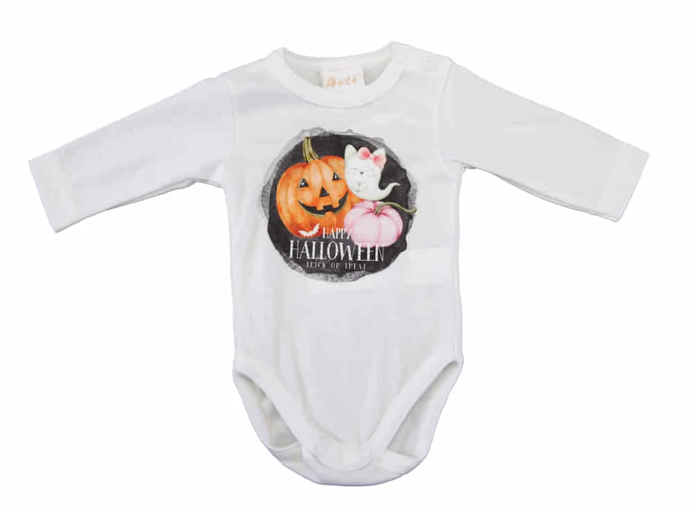 Halloween hosszú ujjú baba body Nagyon cuki Halloween-es mintával nyomott, vállon patentos hosszú ujjú baba body minőségi, bababarát 100% pamut anyagból készült, szín- és formatartó anyagból, ami jól bírja a gyakori mosást is. Vállán patentos, így megkönnyíti a baba öltöztetését. A lába közötti patentos megoldás, pedig a gyors peluscserét teszi lehetővé. Minőségi magyar termék Anyaga: 100% pamut Minőség: I. osztály A termék nikkelmentes patenttal készül. A patent nem tartalmaz nikkelt, ezért nem vált ki allergiás reakciót az erre érzékeny babáknál