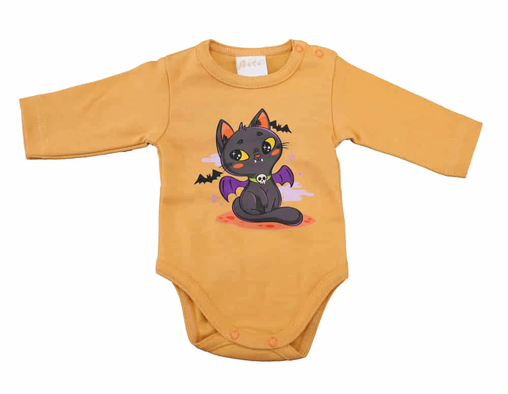 Halloween hosszú ujjú baba body Nagyon cuki Halloween-es mintával nyomott, vállon patentos hosszú ujjú baba body minőségi, bababarát 100% pamut anyagból készült, szín- és formatartó anyagból, ami jól bírja a gyakori mosást is. Vállán patentos, így megkönnyíti a baba öltöztetését. A lába közötti patentos megoldás, pedig a gyors peluscserét teszi lehetővé. Minőségi magyar termék Anyaga: 100% pamut Minőség: I. osztály A termék nikkelmentes patenttal készül. A patent nem tartalmaz nikkelt, ezért nem vált ki allergiás reakciót az erre érzékeny babáknál