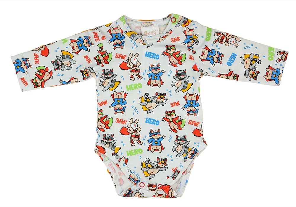 Kényeztesse kis hősét ezzel a mintás, hosszú ujjú kombidresszel! A Hero mintával nyomott, fehér színű body igazán stílusos választás, mely minden kisfiút igazi szuperhőssé varázsol. A vállon található nikkelmentes patentok segítségével könnyedén felvehető és levehető, így a pelenkázás is gyerekjáték lesz. A termék 100% pamutból készült, ami biztosítja a baba bőrének légáteresztő képességét és kényelmét. Az I. osztályú minőség garantálja, hogy a body hosszú ideig szép marad, még a gyakori mosások után is. A nikkelmentes patentoknak köszönhetően nem kell aggódnia az allergiás reakciók miatt, így baba bőre védve lesz minden irritáció ellen. Adja át Ön is a hősiesség érzését kisfiának ezzel a Hero mintás kombidresszel!