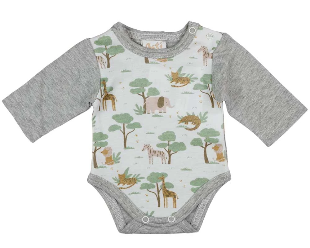 Különleges ajándék lehet az újszülötteknek ez a varázslatosan aranyos, állatos mintával ellátott hosszú ujjú baba body. A szürke színű, vállon patentos dizájn nem csak praktikus, de rendkívül divatos is. Az unisex stílus lehetővé teszi, hogy a kisfiúk és kislányok egyaránt hordhassák. Minőségi magyar termék, amelyet 100% pamutból készítettek, így garantáltan kényelmes viselet lesz a babának. A body első osztályú minőségének köszönhetően tartós és strapabíró, a nikkelmentes patent pedig megóvja a babát az allergiás reakcióktól. A vidám állatminták pedig garantáltan mosolyt csalnak mindenki arcára!