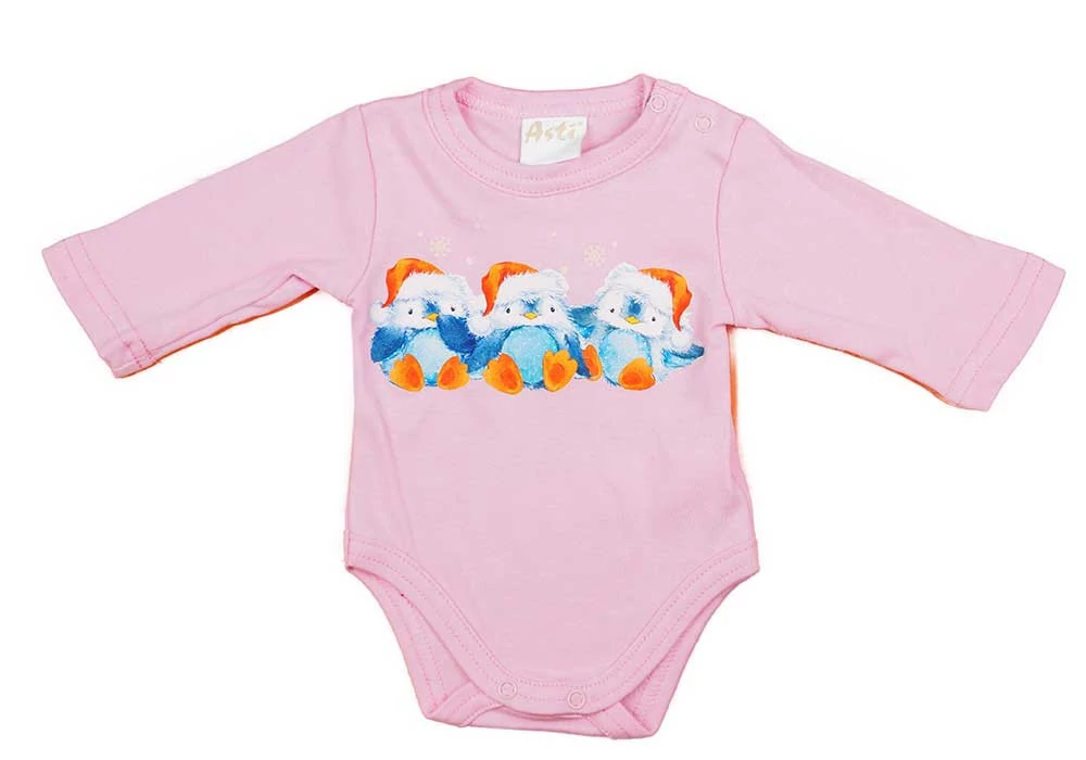 Tengeri színekben pompázó, hosszú ujjú baba body, amelyen egy hihetetlenül cuki bébi pingvin minta díszeleg. A rózsaszínű háttér tökéletesen kiemeli a minta minden részletét, így a kis pingvin még édesebb hatást kelt. A body 100% pamutból készült, ami garantálja a puhaságot és a kényelmet a nap minden pillanatában. Első osztályú minőségű, nikkelmentes patenttal készült, így a legérzékenyebb bababőrt sem irritálja. Bár a bébi pingvin minta karácsonyi hangulatot áraszt, a bodyt a hidegebb hónapokban is bátran viselheti a legkisebb. A termék magyar gyártású, ami a minőségi kivitelezést és a gondos tervezést garantálja. Ez a body nem csak kényelmes és biztonságos választás, de egyben stílusos is. Ki mondta, hogy a babák nem lehetnek trendik?