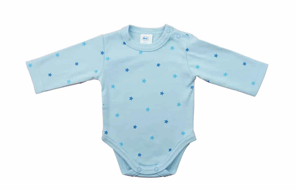 Hosszú ujjú baba body Csillagos mintával Kisbabák ruhatárának praktikus alapdarabja a body. Ez a cuki kis csillagos mintával telenyomott baba body minőségi, bababarát 100% pamut anyagból készült, szín- és formatartó anyagból, ami jól bírja a gyakori mosást is. Vállán patentos, így megkönnyíti a baba öltöztetését. A lába közötti patentos megoldás, pedig a gyors peluscserét teszi lehetővé. Minőségi magyar termék Anyaga: 100% pamut Minőség: I. osztály A termék nikkelmentes patenttal készül. A patent nem tartalmaz nikkelt, ezért nem vált ki allergiás reakciót az erre érzékeny babáknál.