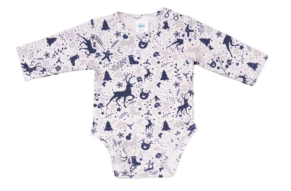 Hosszú ujjú baba body karácsonyi mintával Kisbabák ruhatárának praktikus alapdarabja a karácsonyi mintával díszített, hosszú ujjú baba body, ami tökéletes választás a hideg téli napokra Ez a cuki karácsonyi mintával nyomott baba body minőségi, bababarát elasztikus pamut anyagból készült, szín- és formatartó, ami jól bírja a gyakori mosást is. Vállán patentos, így megkönnyíti a baba öltöztetését. A lába közötti patentos megoldás, pedig a gyors peluscserét teszi lehetővé. Minőségi magyar termék Anyaga: 90% pamut, 10% elasztán Minőség: I. osztály A termék nikkelmentes patenttal készül. A patent nem tartalmaz nikkelt, ezért nem vált ki allergiás reakciót az erre érzékeny babáknál