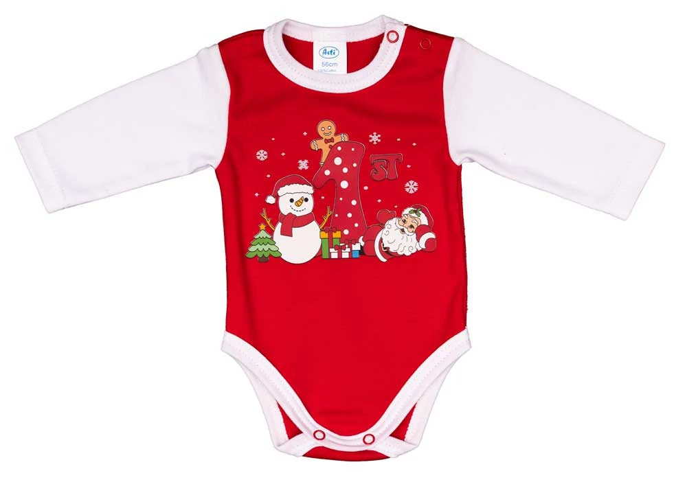 Hosszú ujjú baba body karácsonyi mintával Kisbabák ruhatárának praktikus alapdarabja a karácsonyi mintával díszített, hosszú ujjú baba body, ami tökéletes választás a hideg téli napokra Ez a cuki karácsonyi mintával nyomott baba body minőségi, bababarát 100% pamut anyagból készült, szín- és formatartó, ami jól bírja a gyakori mosást is. Vállán patentos, így megkönnyíti a baba öltöztetését. A lába közötti patentos megoldás, pedig a gyors peluscserét teszi lehetővé. Minőségi magyar termék Anyaga: 100% pamut Minőség: I. osztály A termék nikkelmentes patenttal készül. A patent nem tartalmaz nikkelt, ezért nem vált ki allergiás reakciót az erre érzékeny babáknál