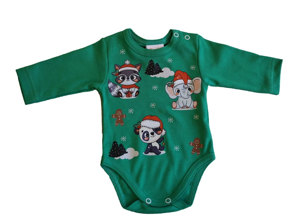 Hosszú ujjú baba body karácsonyi mintával Kisbabák ruhatárának praktikus alapdarabja a karácsonyi mintával díszített, hosszú ujjú baba body, ami tökéletes választás a hideg téli napokra Ez a cuki télapósapis állatok mintával nyomott baba body minőségi, bababarát 100% pamut anyagból készült, szín- és formatartó, ami jól bírja a gyakori mosást is. Vállán patentos, így megkönnyíti a baba öltöztetését. A lába közötti patentos megoldás, pedig a gyors peluscserét teszi lehetővé. Minőségi magyar termék Anyaga: 100% pamut Minőség: I. osztály A termék nikkelmentes patenttal készül. A patent nem tartalmaz nikkelt, ezért nem vált ki allergiás reakciót az erre érzékeny babáknál
