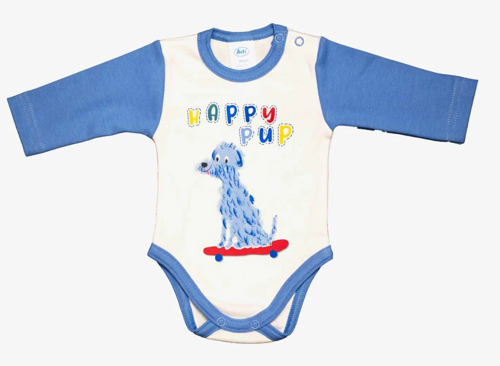 Hosszú ujjú baba body Kutyus mintával Kisbabák ruhatárának praktikus alapdarabja a body. Ez a cuki kutyus mintával nyomott baba body minőségi, bababarát 100% pamut anyagból készült, szín- és formatartó anyagból, ami jól bírja a gyakori mosást is. Vállán patentos, így megkönnyíti a baba öltöztetését. A lába közötti patentos megoldás, pedig a gyors peluscserét teszi lehetővé. Minőségi magyar termék Anyaga: 100% pamut Minőség: I. osztály A termék nikkelmentes patenttal készül. A patent nem tartalmaz nikkelt, ezért nem vált ki allergiás reakciót az erre érzékeny babáknál