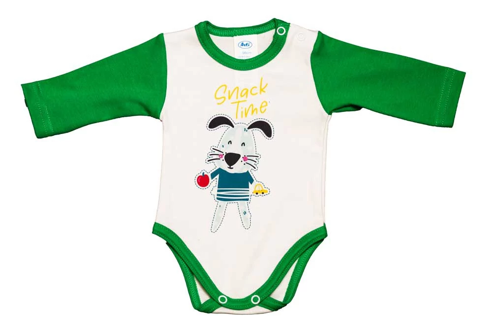 Hosszú ujjú baba body Kutyus mintával Kisbabák ruhatárának praktikus alapdarabja a body. Ez a cuki kutyus mintával nyomott baba body minőségi, bababarát 100% pamut anyagból készült, szín- és formatartó anyagból, ami jól bírja a gyakori mosást is. Vállán patentos, így megkönnyíti a baba öltöztetését. A lába közötti patentos megoldás, pedig a gyors peluscserét teszi lehetővé. Minőségi magyar termék Anyaga: 100% pamut Minőség: I. osztály A termék nikkelmentes patenttal készül. A patent nem tartalmaz nikkelt, ezért nem vált ki allergiás reakciót az erre érzékeny babáknál