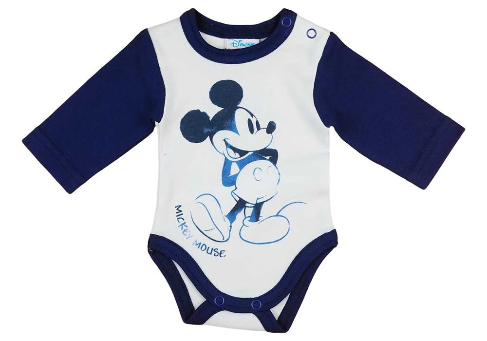 Hosszú ujjú, szürke baba body, amelyen a kedvenc Disney karakterünk, Mickey egér vidám mintája díszeleg. A vállán található patentos kialakítás megkönnyíti a fel- és levételt, így a baba öltöztetése könnyedén, stresszmentesen zajlik. Az eredeti Disney termék garantáltan mosásálló, a minta nem kopik, így hosszú távon is élvezhető a karakter vidám kisugárzása. A minőségi magyar termék anyaga 100% pamut, amely lágyan simul a baba bőrére, nem okoz irritációt, még a legérzékenyebb bőrű babáknál sem. Az I. osztályú minőség gondoskodik arról, hogy a body hosszú ideig megőrizze formáját és színét. A termékben található patent nikkelmentes, így az erre érzékeny babák számára is biztonságos választás.
