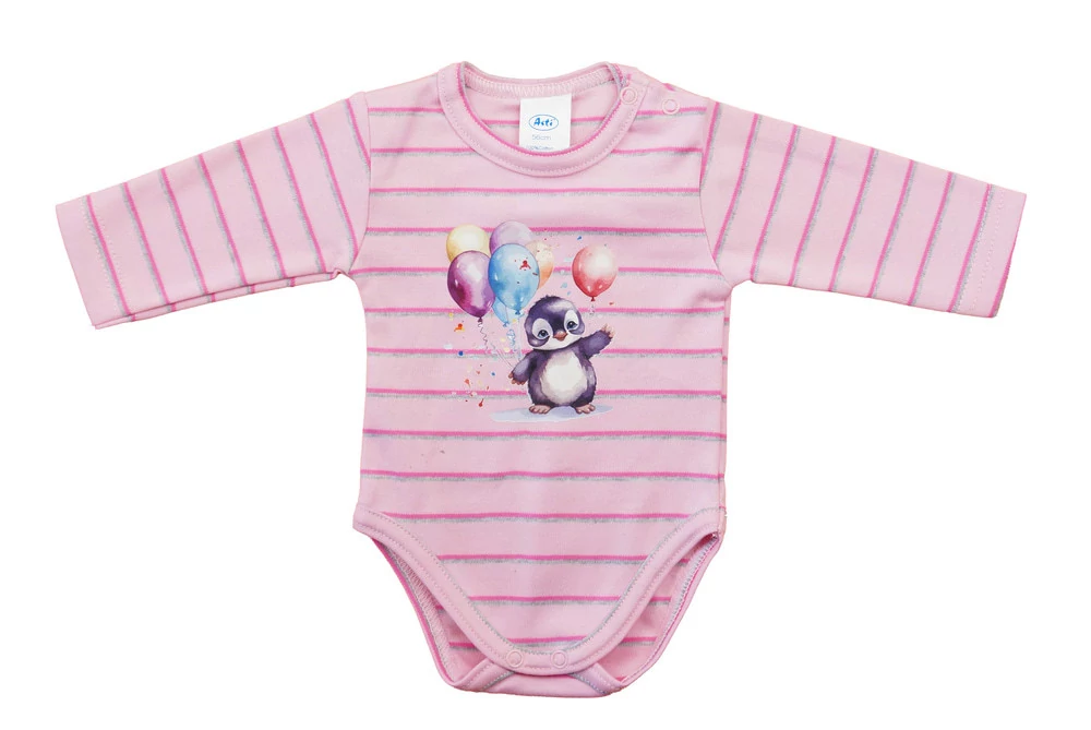 Hosszú ujjú baba body – Puha kényelem minden napra Ez a kedves, csíkos mintájú, nyomott mintával díszített hosszú ujjú baba body a kisbabák ruhatárának igazi alapdarabja. 100% bababarát pamutból készült, amely puha tapintású, jól szellőzik és bírja a gyakori mosást is – így a mindennapi használat során is sokáig megőrzi színét és formáját. A vállán található patentos kialakítás megkönnyíti az öltöztetést, a lábrészen lévő patentok pedig gyors és egyszerű peluscserét biztosítanak. A nikkelmentes patentok kíméletesek az érzékeny bőrhöz, így nem okoznak allergiás reakciót. Főbb jellemzők: •Minőségi magyar termék •100% pamut – puha, légáteresztő és bőrbarát •Szín- és formatartó, gyakori mosás mellett is •Nikkelmentes patentok – biztonságos érzékeny bőrű babáknak •Patent a vállon az egyszerű öltöztetéshez •Patent a lábrészen a gyors peluscseréhez •I. osztályú minőség Miért fogod szeretni? Mert ez a body nemcsak kényelmes és biztonságos, de praktikus is – minden napra tökéletes választás a legkisebbeknek.