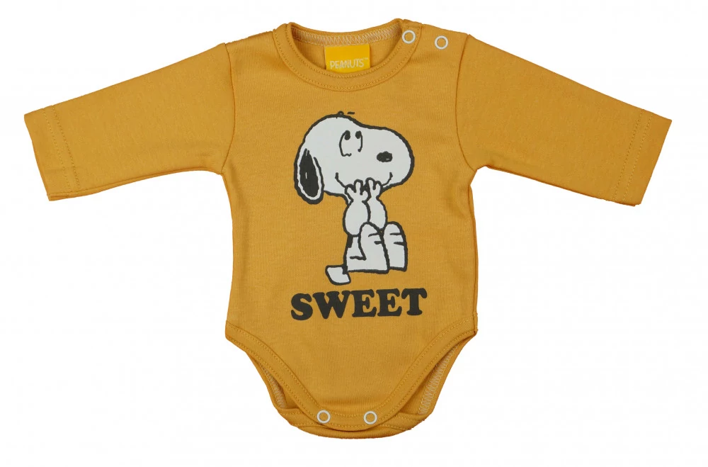 Bájosan játékos, okker színű, hosszú ujjú body, amelyen a kedves Snoopy kutyus vidám mintája élénkíti a napot. Az igényes, 100% pamut anyagból készült, szín- és formatartó kialakítás garantál, hogy kedvence marad a gyakori mosások után is. A vállán található patentos kialakítás megkönnyíti a pelenkázást, míg a lába közötti patentos megoldás a gyors pelenkacsere idején is a segítségünkre van. Minőségi magyar termék, ami a legérzékenyebb bőrű babáknál sem vált ki allergiás reakciót, mert nikkelmentes patenttal készül. Az I. osztályú minőségi jelző garantálja, hogy hosszú ideig örömöt okoz majd a kisbabáknak, és segítségével a mindennapi öltözködés is könnyedén megy majd.