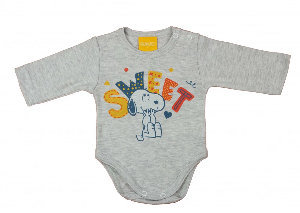 A Snoopy mintával ellátott hosszú ujjú baba body tökéletes választás a kisbabák ruhatárába. Az egyszerű, de stílusos szürke színű ruhadarab 100% pamut anyagból készült, így garantáltan kényelmes és puha viselet a picik számára. A minőségi, formatartó anyag ellenáll a gyakori mosásnak is, így az eredeti állapotát hosszú ideig megtartja. A vállán és a lába között található patentok megkönnyítik a baba öltöztetését és a peluscserét. A termék minőségi magyar gyártmány, nikkelmentes patenttal, így az allergiás reakciókat kiváltó anyagoktól is mentes. A Snoopy mintával ellátott baba body nem csak praktikus, de cuki kiegészítője is lesz a baba ruhatárának.
