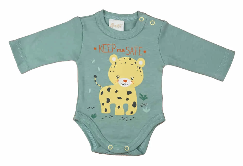 Öltöztesd csemetédet ezzel a hosszú ujjú, tigris mintás bababodyval, amely igazi alapdarabja lesz babád ruhatárának. A tigris minta a zöld alapon igazán játékos és vidám, így garantáltan mosolyt csal mindenki arcára. Készült a bababody kiváló minőségű, 100% pamut anyagból, ami a gyakori mosások ellenére is megőrzi színét és formáját. A vállán található patent megkönnyíti a fel- és levételt, míg a lába közötti patentos megoldás a pelenkacsere gyorsaságát segíti elő. A body Magyarországon készült, így biztos lehetsz benne, hogy kiváló minőségű terméket vásárolsz. Az anyag I. osztályú, és a patent nikkelmentes, így a babák számára semmilyen allergiás reakciót nem vált ki. Adja hát át babájának a tigrisek erősségét és bátorságát ezzel a cuki bababodyval!