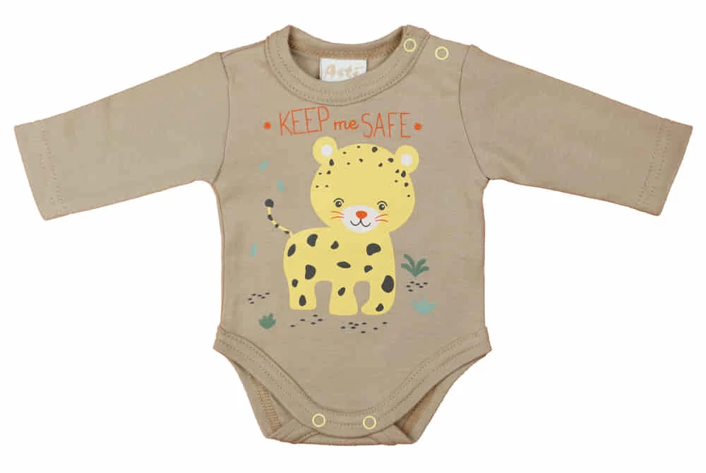 Ezt a hosszú ujjú baba bodyt imádni fogja kisbabája! A tigris mintával nyomott design egyszerre cuki és divatos, a homok szín pedig tökéletesen illik bármilyen kis nadrághoz vagy szoknyához. A minőségi, 100% pamut anyag garantálja, hogy babája mindig kényelmesen és melegen érezze magát, miközben a szín- és formatartó anyag biztosítja, hogy a body még számtalan mosás után is úgy nézzen ki, mintha most vették volna le a polcról. A vállán található patentok megkönnyítik az öltözködést, míg a lába közötti patentok lehetővé teszik a gyors peluscserét. Ez a termék Magyarországon készült, és I. osztályú minőséget képvisel. A nikkelmentes patentokat azok a babák is bátran viselhetik, akik érzékenyek a nikkeltartalmú anyagokra.