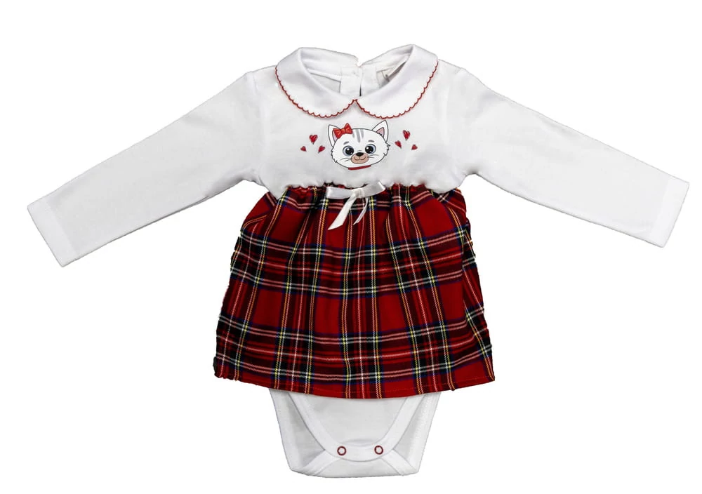 Hosszú ujjú galléros, szoknyás baba body Ebben a csodálatos hosszú ujjú kombidresszben a kis hercegnőd igazán stílusos lesz. A kombidressz aranyos cica mintával díszített. A galléros kialakítás és a hátul található gombok praktikussá teszik a ruhát, míg az elején található masni és a kockás anyagból rávarrt szoknya pedig igazán divatossá. A kombidressz anyaga 100% pamut, míg a kiegészítő anyaga 65% pamut és 35% poliészter, így kellemesen puha a bőrön és kiváló minőségű. Ez a ruha nem csak kényelmes, de stílusos is, és minden kislány szívesen viseli majd. A termék garantálja a minőséget és az autentikus dizájnt Minőségi magyar termék Anyaga: 100% pamut, 65% pamut és 35% poliészter Minőség: I. osztály