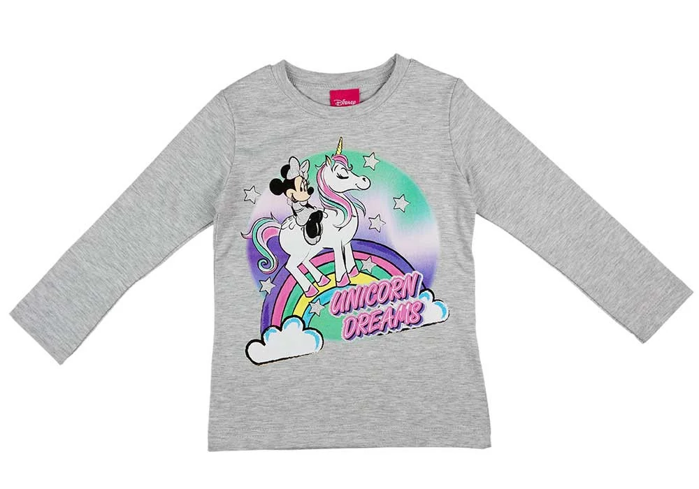Minnie egér és unikornis mintával nyomott, glitteres hosszú ujjú kislány póló.