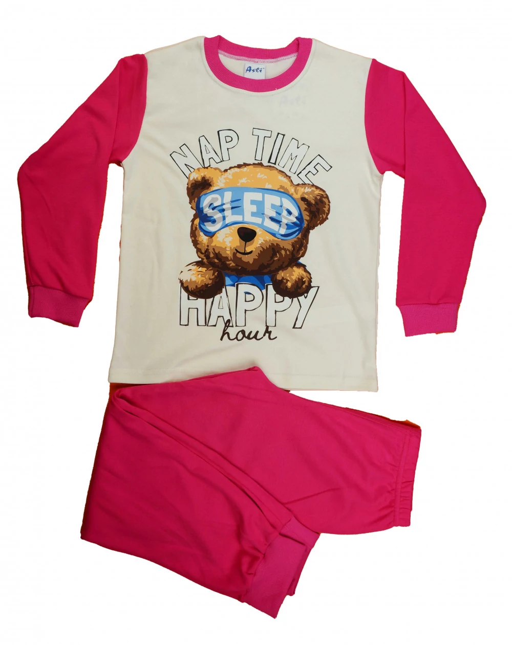 Varázsolj szívet melengető éjszakákat a kislányodnak ezzel a sötét pink, macis mintás hosszú ujjú pizsamával! A lágy, 100% pamut anyag biztosítja a kényelmet és a melegséget a hűvösebb éjszakákon, míg a bájos macis minta garantáltan mosolyt csal a kicsi arcára. Minőségi I. osztályú termék, amelyet gondosan válogattunk a legkisebbek számára. Kérjük, hogy a rendelésnél vegye figyelembe, hogy a termék mérete a testalkat függvényében eltérhet a kívánt mérettől. Álomszép éjszakákat kívánunk a legédesebb macis pizsamában!