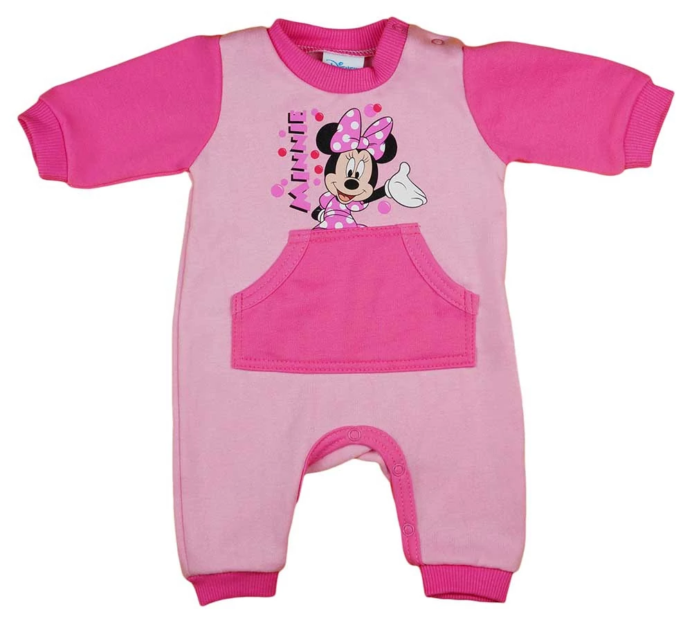 Minnie egér mintával nyomott, kenguruzsebes, vállon patentos hosszú ujjú baba rugdalózó.