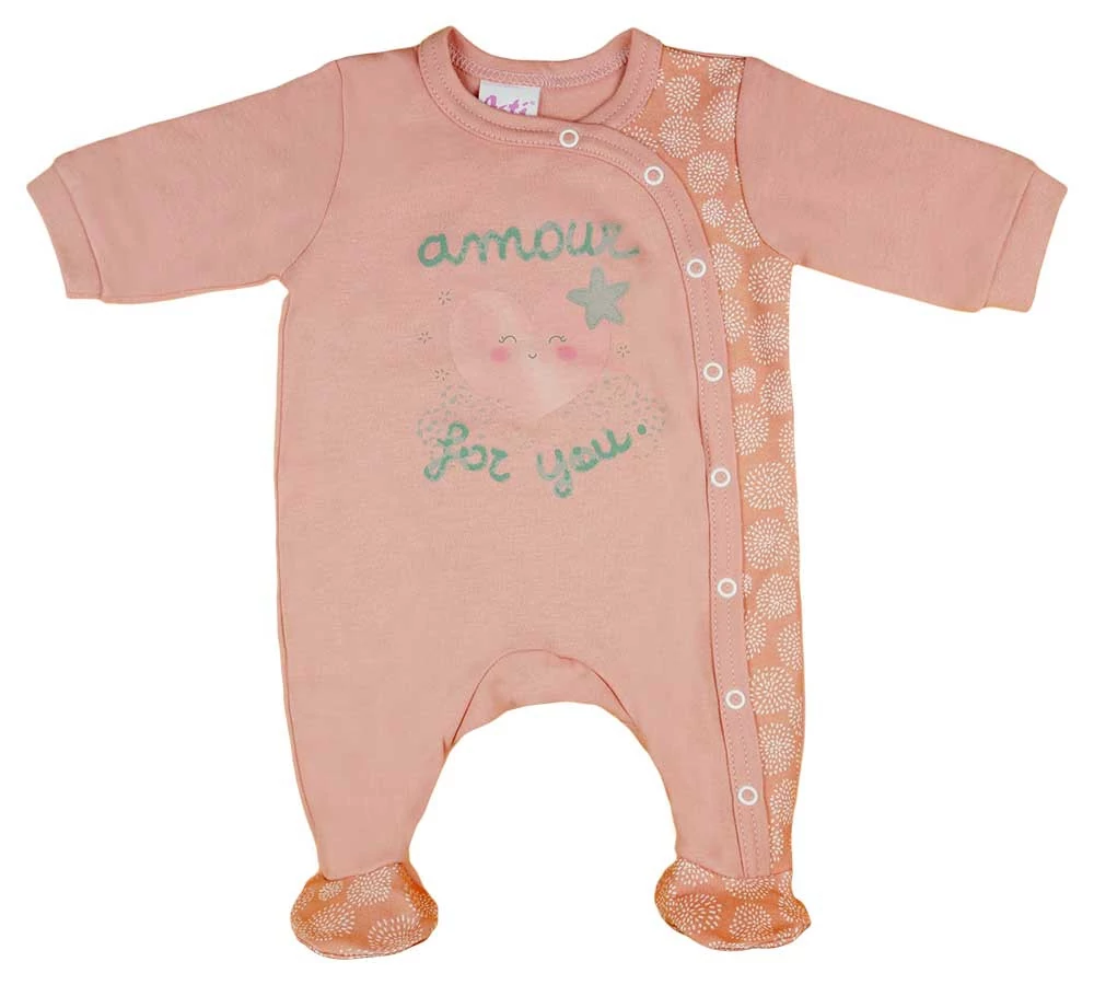 Öltöztesse kis hercegnőjét ebben a bájos, szívecskés mintával díszített vékony pamut rugdalózóban! A púderszínű, hosszú ujjú ruhadarab tökéletes választás lehet a hűvösebb napokra, hisz a 90% pamut és 10% elasztán anyagösszetétel révén a babák bőre könnyen lélegzik alatta, miközben a rugdalózó is kényelmesen illeszkedik a mozgékony kis testükre. Az elöl található nikkelmentes patentok segítségével pedig egyszerűen felvehető és levehető, ami különösen praktikus pelenkázáskor. Minőségi magyar termék, amelyet az Andrea Kft. készített, figyelembe véve azokat a speciális igényeket, amelyeket a babák érzékeny bőre támaszt. Tehát nem csak stílusos, de biztonságos választás is ez a szívecskés rugdalózó!