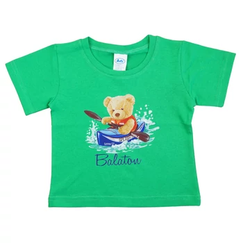 Rövid ujjú Balatonos macis póló Ez a rövid ujjú póló tökéletes választás a kis strandolók számára. A puha, bőrbarát 100% pamut anyag gondoskodik arról, hogy gyermekünk mindig kényelmesen és szabadon mozogjon. A póló zöld színe igazán friss és tiszta látványt nyújt, míg a Balatonos kajakos maci mintája mindenkit elvarázsol. Klasszikus szabása pedig garantálja, hogy soha nem megy ki a divatból. Ráadásul könnyen kezelhető és jól mosható, így színét és formáját hosszú távon is megőrzi. Büszkén mondhatjuk, hogy ez a minőségi termék hazánkban készült, és az I. osztályú minőséget képviseli. Adjunk a kicsiknek egy kis Balaton-varázslatot minden nap!
