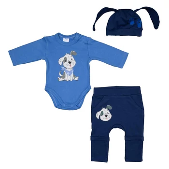 3 részes kisfiú szett kutyus mintával A kisfiúk divatjának legújabb trendjét képviseli ez a 3 részes szett, amelynek minden darabja Magyarországról származik. Az összeállításban található hosszú ujjú body, egy kutyafüles sapi és kényelmes baba nadrág igazán vagány és kispasis hangulatot kölcsönöz viselőjének. Mindkét darab finom pamut anyagból készült, a nadrág rugalmas pamutja pedig szabad mozgást biztosít a babának. A szett kiváló minőségű, jól mosható, szín- és formatartó anyaga miatt nemcsak a babák, de az anyukák kedvence is lesz! A body 100% pamutból, a nadrág és a sapka 90% pamutból és 10% elasztánból készült, ezáltal biztosítva a kiváló minőséget. A termék nikkelmentes patenttal készül, így az érzékeny babák sem fognak allergiás reakciót tapasztalni. Minőségi magyar termék Minőség: I. osztály
