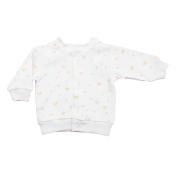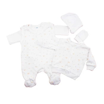 Baba szett, 5 részes, madárka mintával A csomag tartalmaz egy ujjatlan vállon patentos rugdalózót telenyomott madárkás mintával , hosszú ujjú, egyszínű ,vállon patentos baba bodyt és egy elöl patentos, telenyomott, madárka mintás baba kocsikabátot ami tökéletes választás lesz a hűvösebb napokra. A csomagban található baba sapka és a baba kesztyű pedig hozzáadja az utolsó simításokat ehhez az elegáns készlethez. Az összes darab 100% pamutból készült, ami puha és kényelmes viseletet biztosít a babának. Ez a magyarországi termék I. osztályú minőségű, és a termékben használt nikkelmentes patentok nem okoznak allergiás reakciót a nikkellel szemben érzékeny babákban. Magyar termék Anyaga: 100% pamut Minőség: I. osztály