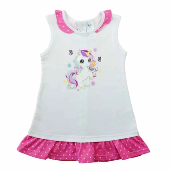 Ujjatlan vékony pamut kislány ruha Ez a könnyed, ujjatlan kislány ruha igazi nyári kedvenc lesz! Vidám színvilága és bájos mintája azonnal elnyeri a gyerekek és a szülők tetszését is, míg a vékony, 100% pamut anyag kellemes viseletet biztosít a legmelegebb napokon is. A ruha hátul cipzárral záródik, így könnyen feladható, a szabása pedig szabad mozgást és kellemes szellőzést nyújt. Az alján és nyakán található pöttyös mintás fodor játékos, kislányos részlet, amitől ez a darab még különlegesebb lesz. Első osztályú minőség, puha tapintás, gyengéd a gyermek bőréhez – ez a ruha minden nyári kalandhoz tökéletes választás. Öltöztesse gyermekét stílusosan és komfortosan ezzel a csinos, mégis praktikus kisruhával – ideális választás egy nyári sétához, óvodai naphoz vagy családi eseményhez is! Minőségi magyar termék Anyaga: 100% pamut, Minőség: I. osztály
