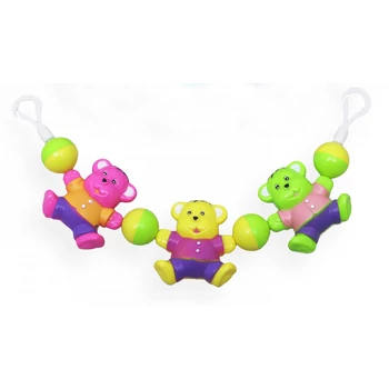 A rugalmas zsinórra felfűzött kedves figurák szórakoztatják a gyermeket.