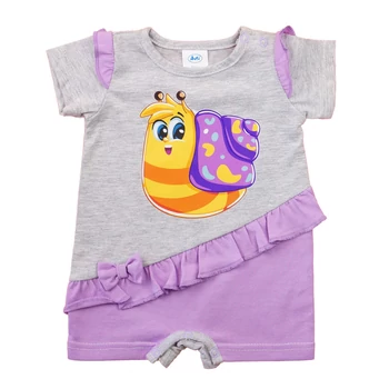 Rövid ujjú kislány baba napozó - csiga mintával Ellenállhatatlanul cuki ez a baba napozó, mely minőségi bababarát pamut anyagból készült, ami enyhén rugalmas, így kényelmes viseletet biztosít kisbabánknak akár egész napra. A napozó elejét kedves minta díszíti, a fodrok és a masni pedig még cukibbá varázsolják. A napozó váll részen patentos, így megkönnyíti az öltöztetést és a lába közötti patentok pedig a gyors peluscserét segítik. Forró nyári napokra tökéletes választás. Minőségi magyar termék Anyaga: 100% pamut Minőség: I. osztály A termék nikkelmentes patenttal készül.