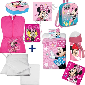 Disney Minnie ovis zsák szett, komplett ovis kezdőcsomag, amely egy Minnie ovis zsákból, hozzá illő tornazsákból és komplett pamut ovis ágynemű garnitúrából áll és oviban használatos, kiegészítő termékekből áll. Az ovis zsák nagy zsebes, elől cipzáros, vállfára akasztható, megfelel az óvodák által elvárt méretezésnek.