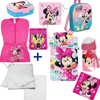 Disney Minnie ovis zsák szett, komplett ovis kezdőcsomag, amely egy Minnie ovis zsákból, hozzá illő tornazsákból és komplett pamut ovis ágynemű garnitúrából áll és oviban használatos, kiegészítő termékekből áll. Az ovis zsák nagy zsebes, elől cipzáros, vállfára akasztható, megfelel az óvodák által elvárt méretezésnek.