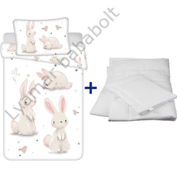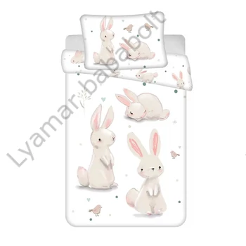 Nyuszis 100x135cm-s gyerek ovis ágynemű szett. Az ovis ágynemű garnitúra 100% pamutból, tartós, színtartó nyomással készült, gépi mosással, 40 fokon mosható. |