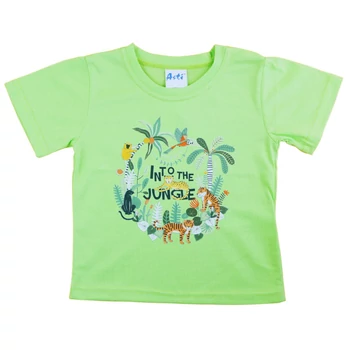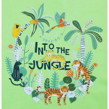 Rövid ujjú fiú póló dzsungel mintával Egy igazi kis dzsungel rajongónak nélkülözhetetlen darab ez a rövid ujjú fiú póló, amelyen kedvenc állatai díszelegnek. Az zöld színű póló kiváló minőségű, 100% pamut anyagból készült, ami garantálja a hosszú élettartamot és a viseleti kényelmet. A vidám minta pedig minden kisfiú arcára mosolyt csal. Büszkén mondhatjuk, hogy ez a póló magyar termék, melyet első osztályú minőség jellemzi. Hagyd, hogy gyermeked szabadon kifejezze rajongását az állatok iránt ezzel a laza, vidám pólóval! Minőségi magyar termék Anyaga: 100% pamut Minőség: I. osztály