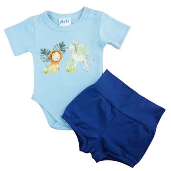 2 részes rövidnadrágos kisfiú szett szafaris mintával A kisfiúk divatjának legújabb trendjét képviseli ez a 2 részes szett, amelynek minden darabja Magyarországról származik. A szett egy magasderekú rövidnadrágot és egy egyszínű rövid ujjú bodyt tartalmaz, igazán vagány és kispasis hangulatot kölcsönöz viselőjének. Mindkét darab finom pamut anyagból készült, a nadrág rugalmas pamutja pedig szabad mozgást biztosít a babának. A szett kiváló minőségű, jól mosható, szín- és formatartó anyaga miatt nemcsak a babák, de az anyukák kedvence is lesz! A body 100% pamutból, a nadrág 90% pamutból és 10% elasztánból készült, ezáltal biztosítva a kiváló minőséget. A termék nikkelmentes patenttal készül, így az érzékeny babák sem fognak allergiás reakciót tapasztalni. Minőségi magyar termék Minőség: I. osztály