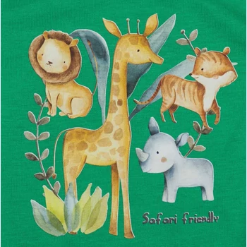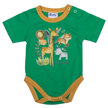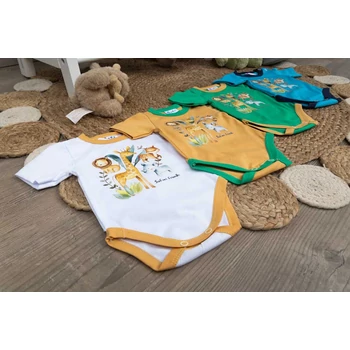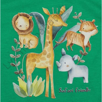 Rövid ujjú baba body Szafari mintával A zöld színű, rövid ujjú baba body vagány szafaris mintával varázsolja még édesebbé kisbabáját. A vidám szafaris minta garantáltan mosolyt csal az arcára minden kisgyermeknek és szülőnek egyaránt. Kiváló választás lehet mindennapi viseletként, hiszen könnyen kombinálható más ruhadarabokkal. A 100% pamut anyagból készült body puha, kényelmes viseletet biztosít a baba érzékeny bőrének, miközben megóvja azt az irritációtól. A termék könnyen tisztítható, nikkelmentes patenttal készül, így az erre érzékeny babák bőrét sem irritálja. Válaszd ezt a minőségi magyar terméket, amely első osztályú minőségben készült, és öltöztesd babádat a legjobbba! Minőségi magyar termék Anyaga: 100% pamut, Minőség: I. osztály