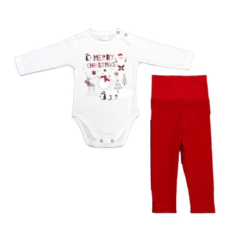 Karácsonyi 2 részes baba szett Ünnepelje karácsonyt ezzel a kétrészes baba szettel, aranyos karácsonyi mintával díszített fehér body, és a kényelmes baba nadrág igazán vagány és hangulatot kölcsönöz viselőjének. Mindkét darab finom pamut anyagból készült, a nadrág rugalmas pamutja pedig szabad mozgást biztosít a babának. A szett kiváló minőségű, jól mosható, szín- és formatartó anyaga miatt nemcsak a babák, de az anyukák kedvence is lesz! Ne csak a karácsony legyen különleges, varázsolja minden napot ünneppé ezzel a csodálatos babaszettel! A body 100% pamutból, a nadrág 90% pamutból és 10% elasztánból készült, ezáltal biztosítva a kiváló minőséget. A termék nikkelmentes patenttal készül, így az érzékeny babák sem fognak allergiás reakciót tapasztalni.