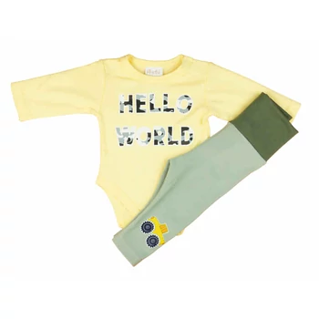 A kisfiúk divatjának legújabb trendjét képviseli ez a 2 részes, pasztel sárga szett, amelynek minden darabja Magyarországról származik. Az összeállításban található hosszú ujjú body és kényelmes baba nadrág igazán vagány és kispasis hangulatot kölcsönöz viselőjének. Mindkét darab finom pamut anyagból készült, a nadrág rugalmas pamutja pedig szabad mozgást biztosít a babának. A szett kiváló minőségű, jól mosható, szín- és formatartó anyaga miatt nemcsak a babák, de az anyukák kedvence is lesz! A body 100% pamutból, a nadrág 90% pamutból és 10% elasztánból készült, ezáltal biztosítva a kiváló minőséget. A termék nikkelmentes patenttal készül, így az érzékeny babák sem fognak allergiás reakciót tapasztalni.