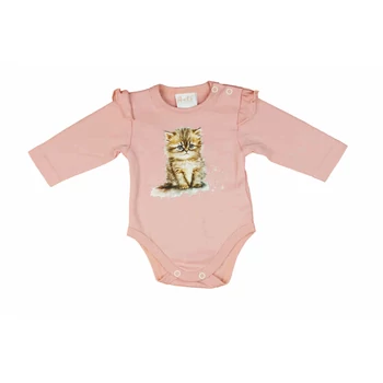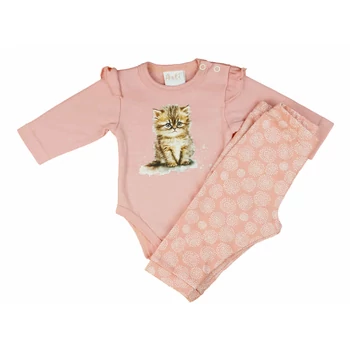 Egy igazi kislányos álom ez a 2 részes cicás szett! A szettben található hosszú ujjú fodros vállú body és a baba nadrág együttese kényelmes és stílusos viseletet biztosít a kicsi számára. A púder színű ruha a cicás mintájával egyszerre cuki és trendi. A finom pamut anyagból készült body és a rugalmas pamutból készült nadrág kényelmes viseletet biztosít, miközben a babának szabad mozgástér marad. A jól mosható, szín- és formatartó anyag hosszú távú használatot tesz lehetővé, így az anyukák is imádni fogják! A szett minőségi magyar termék, amely a legmagasabb, I. osztályú minőségben készül. A body és a nadrág anyaga 100%, illetve 90% pamut és 10% elasztán, garantálva a tartós és kényelmes viseletet. A termék nikkelmentes patenttal készül, így az arra érzékeny babák sem fognak allergiás reakciót tapasztalni. Adja meg a kislányának a legjobbat ezzel a cuki cicás szettel!