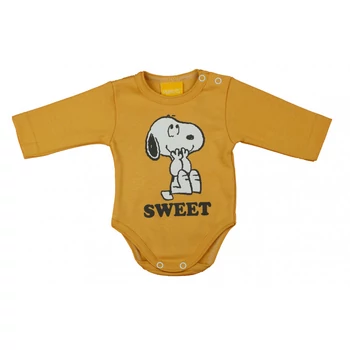 Bájosan játékos, okker színű, hosszú ujjú body, amelyen a kedves Snoopy kutyus vidám mintája élénkíti a napot. Az igényes, 100% pamut anyagból készült, szín- és formatartó kialakítás garantál, hogy kedvence marad a gyakori mosások után is. A vállán található patentos kialakítás megkönnyíti a pelenkázást, míg a lába közötti patentos megoldás a gyors pelenkacsere idején is a segítségünkre van. Minőségi magyar termék, ami a legérzékenyebb bőrű babáknál sem vált ki allergiás reakciót, mert nikkelmentes patenttal készül. Az I. osztályú minőségi jelző garantálja, hogy hosszú ideig örömöt okoz majd a kisbabáknak, és segítségével a mindennapi öltözködés is könnyedén megy majd.