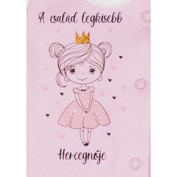 A család legkisebb hercegnője számára készült ez a hosszú ujjú, vékony pamut rugdalózó, melynek ártatlan rózsaszín színe tökéletesen kiegészíti a cuki mintát. Minőségi magyar termék, amelyet a babák kényelme és egészsége érdekében nikkelmentes patenttal láttunk el, így biztosak lehetünk benne, hogy nem okoz allergiás reakciót még az erre érzékeny csemetéknél sem. Az Andrea Kft. által készített rugdalózónk 100% pamutból készült, így garantáltan puha, kényelmes és bőrbarát. Elöl patentos kialakítása segíti a könnyű öltöztetést. Mindezek mellett ez a rugdalózó I. osztályú minőséget képvisel, így biztos lehet benne, hogy a legjobbat adja gyermekének.