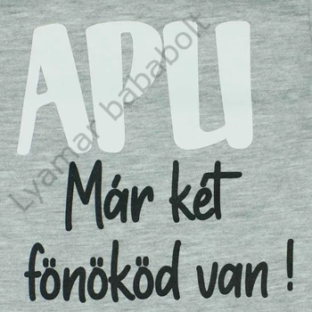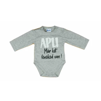 Puha, meleg és kényelmes viselet a hidegebb napokra - ez jellemez leginkább ezt a szürke, feliratos hosszú ujjú baba bodyt. A vállon elhelyezett patentok segítségével könnyedén fel- és levehető, így a pelenkázás sem jelent majd gondot. A 100% pamut anyag garantálja, hogy a bőr lélegezni tudjon, az Andrea Kft. minőségi magyar terméke pedig biztosítja, hogy a body tartós és strapabíró lesz. Az I. osztályú minőségű termék nikkelmentes patenttal készül, így az arra érzékeny babák sem fognak allergiás reakciót tapasztalni. Tökéletes választás lehet ez a body mindennapi használatra, vagy akár ajándékba is.