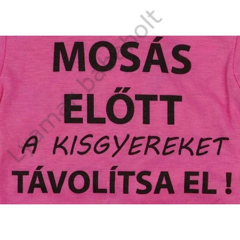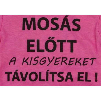 Egy cuki és vagány kis rózsaszín body, melyen humoros felirat található: "Mosás előtt a kisgyereket távolítsa el!". Ez a kis darab garantáltan mosolyt csal mindenki arcára, aki csak meglátja. Rövid ujjú kialakítása ideális a melegebb napokra, vállán pedig praktikus patenttal van ellátva a könnyű fel- és levétel érdekében. A body 100%-ban pamutból készült, ami a bőrnek maximális kényelmet nyújt, és nem okoz irritációt. Minőségi magyar termék, amit a hazai Andrea Kft. állít elő. A termék nikkelmentes patenttal készült, így az érzékeny babák bőre sem irritálódik. Válassza ezt a vidám, szuper kényelmes bodyt, hogy kisbabája is részese lehessen a vidám nyári napoknak!
