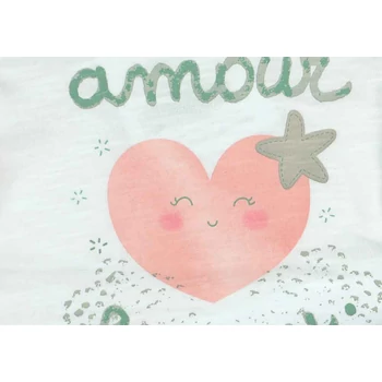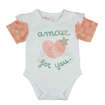 A szívecskés mintával díszített rövid ujjú baba body igazán aranyos és kedves választás a kicsi számára. A vállán található patentok megkönnyítik az öltöztetést, a fodrok pedig további díszítése a ruhának. A vékony pamut anyag biztosítja a kényelmet és a szabad mozgást, így a baba jól érzi magát még a forróbb napokon is. A minőségi magyar termék, amelyet az Andrea Kft. készített, nikkelmentes patenttal rendelkezik, így nem okoz allergiás reakciót a nikkellel szemben érzékeny babáknál. A fehér szín és a szívecskés minta igazán lányos és játékos, tökéletes választás minden kis hercegnő számára.