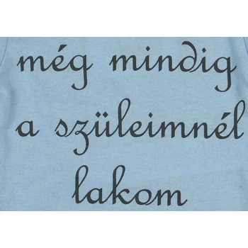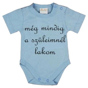 A "még mindig a szüleimnél lakom" feliratos baba body vidám és egyben cuki megjegyzést tesz a kicsik mindennapjaiba. A rövid ujjú, kék színű body kényelmes viseletet biztosít a babának, míg a vállon elhelyezett patentok egyszerűbbé teszik az öltöztetést. Készült 100% pamutból, mely hipoallergén és kényelmes viseletet biztosít a legérzékenyebb bababőr számára is. Büszkén mondhatjuk, hogy ez a termék minőségi magyar gyártású, az Andrea Kft. műhelyéből. A termékben használt patent nikkelmentes, így az erre érzékeny babák számára is biztonságosan használható. Adj egy kis humoros csavart a babaruha kollekciódnak ezzel a bájos, feliratos bodyval!