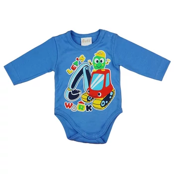 Hosszú ujjú baba body munkagépes mintával Munkagépes mintával nyomott, hosszú ujjú, vállon patentos pamut baba body. Minőségi magyar termék |