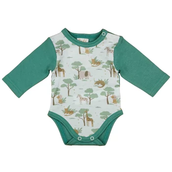Öltöztesse be csemetéjét ebbe a bájos, állatos mintával díszített, hosszú ujjú baba bodyba! A zöld színű, kiváló minőségű magyar termék bármely kisfiúnak vagy kislánynak remek választás lehet, hiszen unisex kialakítású. A vállán lévő nikkelmentes patentok megkönnyítik az öltöztetést, és még az allergiára hajlamos babák számára is biztonságosak. Készült 100% pamutból, ami lágyan simul a baba bőrére és kiválóan szellőzik. Az állatos minta pedig garantáltan mosolyt csal minden kisgyermek arcára!