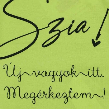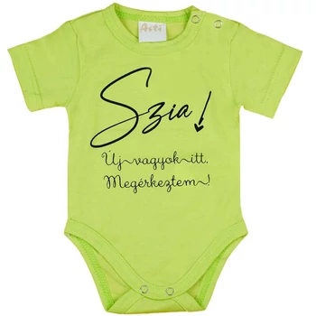 Ez a rövid ujjú feliratos baba body ideális választás a melegebb hónapokra, hiszen 100% pamut anyagból készült, amely lélegző és kényelmes viseletet biztosít a kisbabának. A zöld színű, feliratos design pedig igazán stílusos megjelenést kölcsönöz. A lábak közötti és a vállán található patentok segítségével a peluscserét és az öltöztetést is könnyedén elvégezhetjük. Minőségi magyar termék, amely a legmagasabb, I. osztályú minősítéssel rendelkezik. A termék nikkelmentes patenttal készül, így az arra érzékeny babák számára is biztonságos választás. Ugyanakkor a body unisex designja révén lányoknak és fiúknak egyaránt remek választás. Válaszd ezt a baba bodyt, ha szeretnéd, hogy kisbabád divatos és kényelmes legyen!