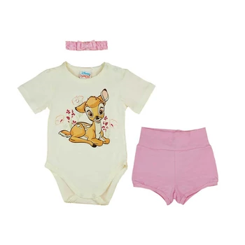 Rövidnadrágos kislány babaruha szett Bambi mintával Eredeti Disney termék Nagyon cuki és igazán csinos ez a háromrészes kislány szett, ami egy rövidujjú baba bodyt, egy rövidnadrágot és egy gumis, rávarrt masnis fejpántot tartalmaz. Minőségi, finom elasztikus pamut anyagból készült, ami tökéletes követi kisbabánk alakját és szabad mozgást biztosít akár egész napra. A body vállon patentos, ami megkönnyíti az öltöztetést, a lába közötti patentos megoldás pedig a peluscserénél nagy segítség. A szett a Bambi kollekció darabja. Minőségi magyar termék Nadrág és fejpánt anyaga: 90% pamut, 10% elasztán |