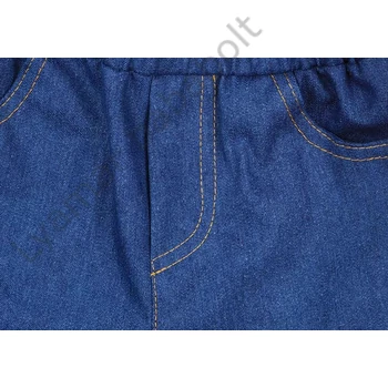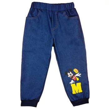 Vékony, 100% pamut anyagból készült, gumis derekú kisfiú farmernadrág, egyik lábszárán Mickey egér mintával nyomva. Praktikus alapdarabja kisbabánk ruhatárának. Színe és fazona miatt jól varihálható rövid vagy hosszú ujjú bodyval. Könnyen kezelhető, jól mosható, szín és formatartó anyagból készült. Nem elasztikus!