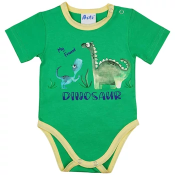 Rövid ujjú kisfiú baba body dinós mintával - a tökéletes választás a kis felfedezőknek! Ez a zöld színű, dinoszaurusz mintával díszített body garantáltan elnyeri kisfiad tetszését. A 100% vékony, nyári pamut anyagból készült ruhadarab egész napos kényelmet biztosít a babánknak, legyen szó játszásról, pihenésről vagy akár a nagy kalandokról. A vállán található patentoknak köszönhetően könnyedén fel- és leöltöztethetjük őt, míg a minőségi anyag biztosítja a termék hosszú élettartamát, forma- és színtartó tulajdonságait. A baba body minden részletében a magyar minőséget képviseli - nikkelmentes patenttal készült, így az arra érzékeny babák sem fognak allergiás reakciót tapasztalni. Tegye mindennapjait színesebbé és vidámabbá ezzel a dinoszauruszos baba bodyval!