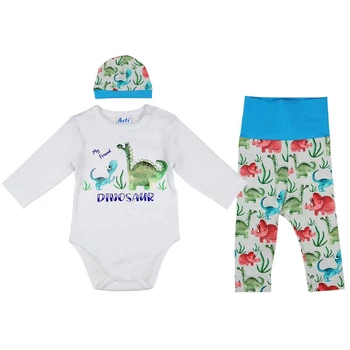 Vagány kisfiúknak készült ez a 3 részes dinós szett, ami egy alul és vállnál patentos bodyból, egy dinós baba nadrágból és egy sapkából áll. A szett fehér színű, dinós mintával, ami igazán játékos és vidám hangulatot kölcsönöz a ruhadaraboknak. A szett darabjait együtt is lehet hordani, de természetesen tökéletesen kombinálhatóak más ruhadarabokkal is. A magas pamuttartalomnak köszönhetően a ruhák bőrbarátok, könnyen kezelhetőek, jól moshatóak, szín- és formaállóak. A szett minőségi magyar termék, amelynek anyaga 100% pamut, míg a nadrág és a sapka 90% pamutból és 10% elasztánból készült. Az I. osztályú minőség garantálja, hogy a ruhák hosszú időn keresztül megőrzik szépségüket és minőségüket. A termék nikkelmentes patenttal készül, így azok a babák is bátran hordhatják, akik érzékenyek a nikkelre. A patentok nem tartalmaznak nikkel, ezért nem váltanak ki allergiás reakciót. Legyen a kisfiúk öltözködése is vidám és játékos ezzel a dinós szettel!